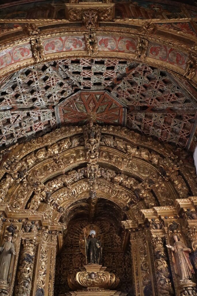 O teto da capela-mor (*) é uma joia rara do estilo mudéjar, octogonal e parcialmente encoberto pelo altar, enquanto os retábulos laterais exibem a Imaculada Conceição, a Santa Cruz, São Paulo, São Pedro, São Rafael Arcanjo e São João Baptista.