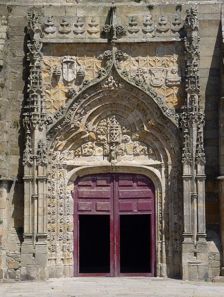 O pórtico principal é um programa iconográfico de grande riqueza: três arcos trilobados ladeados por esculturas.