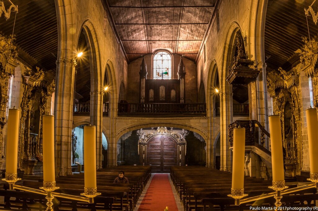 A pia batismal manuelina, os altares barrocos e os vitrais de 1909, executados em Paris, reforçam a dimensão artística do templo.