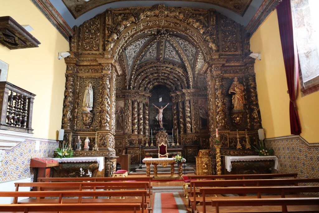 O arco triunfal de volta perfeita abre-se para um espaço sagrado que explode em luz, onde a talha dourada, laboriosamente esculpida em acantos e motivos vegetalistas de finais do século XVII e inícios do XVIII, reveste a pedra, transfigurando-a numa apoteose barroca. A abóbada estelar policromada paira sobre a cena, coroando o Santo Cristo, a imagem de devoção trazida para a Capela mandada erigir por António Colmeiro de Morais. Este culto, popularíssimo, relegou São Vicente para a penumbra honrosa do retábulo colateral, passando o templo a ser popularmente conhecido pela designação do seu novo protagonista: a Igreja do Santo Cristo. Este fenómeno espelha a dinâmica da fé, onde a necessidade devocional do presente reescreve a hierarquia da memória. No altar-mor, o Santo Cristo é ladeado por São Francisco Xavier (lado da Epístola) e Santo António (lado do Evangelho).