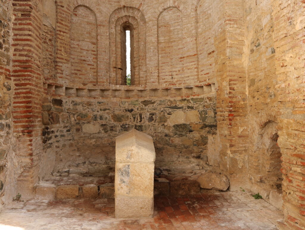 A abside e dois absidíolos tem alvenaria de tijolo (ladrilhos) com arcaturas cegas sobrepostas com remate semi-circular e revestimento em tijolo, com manifesta influência inspiradora da arte leonesa e o templo de Santo Tirso de Sahagun, constituindo no nosso país exemplo raro, apesar da igreja de santa Maria do Castelo em Bragança também ter na sua estrutura base românica tijolo.